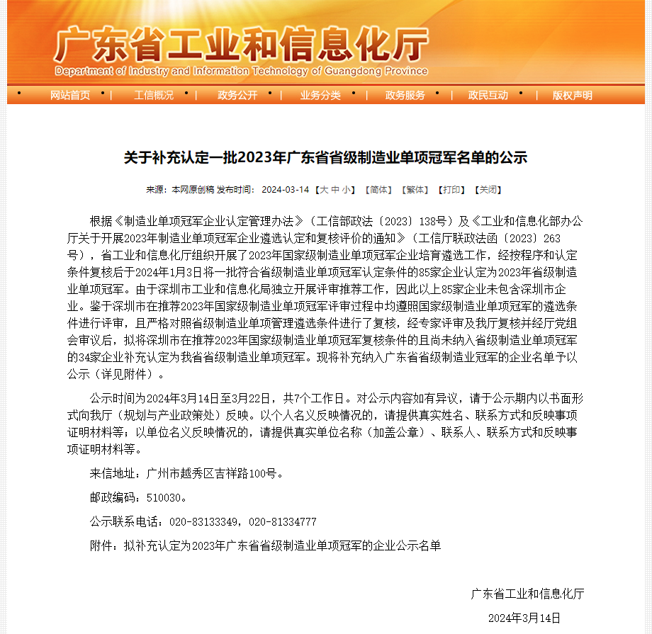近日,广东省工业和信息化厅公布了《拟补充纳入2023年广东省省级制造业单项冠军企业名单》,卡儿酷凭借在汽车应急启动电源的领先优势脱颖而出,与其他33家企业被认定为2023年广东省制造业单项冠军。