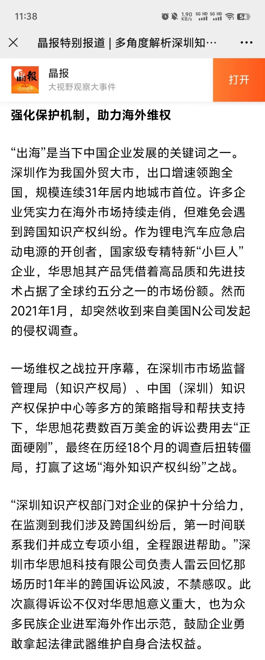 幸运的是,深圳知识产权保护中心监测到企业涉337调查信息后,第一时间快速响应,告知我们涉诉情况,为我们抢占先机、争取时间。在知识产权保护中心的支持和鼓励下,我司的知识产权保护团队,积极开展海外维权工作,赢得了终裁的胜利。